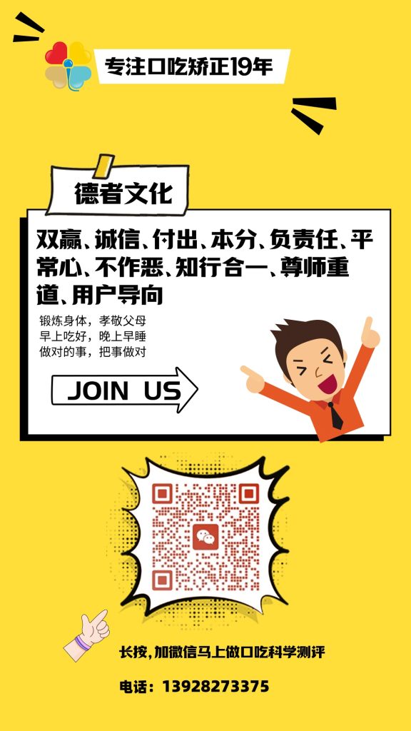 口吃学员应该相信自己的语言能力:发音器官正常,思维正常。口吃学员不是低能儿,口吃也不是不治之症。其实,口吃学员有语言康复的优势。